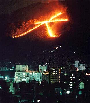 August 16: Daimonji Okuribi. Kyoto. The dead are sent away with fires burning on the hills surrounding the city. The largest fire is in the shape of the Chinese character “Dai” (Great).